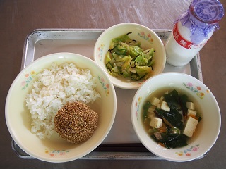 今日の給食 投稿日時 : 2016/02/08 ei/ho ★麦ごはん★牛にゅう★とうふの五目スープ★ごまつくね焼き★即席づけ 今日は、ごまをたっぷり使ったメニューでした。ごまには、たくさんの栄養が含まれています。中でもカルシウムは、牛にゅうの5倍入っているといわれています。他にもごまには、ガンやひん血を予防するはたらきもあるそうですよ。今日は、そんなごまを使った「ごまつくね焼き」でした。香ばしくておいしかったですね。