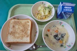 給食時間に一年生の教室に行ってみました。ごまトーストをとてもおいしそうに食べていました。「おいしかったです。」と笑顔で言ってくれた人もいました。給食を作ってよかったと思える瞬間でした。これからもがんばります。