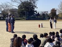 その後は消火器の使い方の実演。児童代表が訓練用の水消火器を使った消火体験を行いました。
