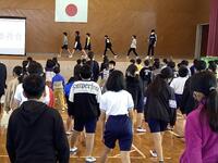 「もも上げ」や「アキレス腱伸ばし」「その場でジャンプ」など、実演付きで紹介してくれました。私も今までたくさんの学校を見てきましたが、準備運動を実演付きで紹介するのはオンリーワンのナイスアイデアでした! その後は、本番にベストの力を出せるように体育委員からエールを送ってもらいました。