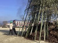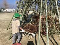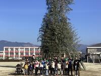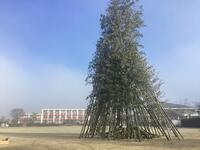 緑の少年団事務局の皆さんが早朝から立派に竹のやぐらを組んでいただき、昼前には無事点火できました。その後は、自作の竹ざおでお餅を焼いたり豚汁をいただいたりして楽しく過ごしました。