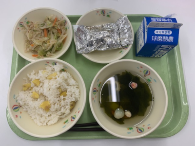 栗ごはん、牛乳、さんまホイル巻、すまし汁、おかかあえでした。