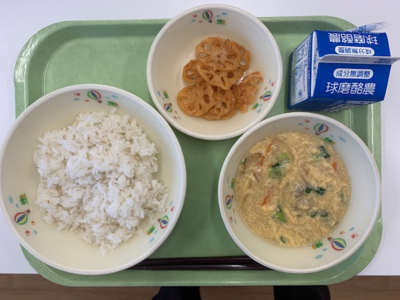 麦ごはん、牛乳、親子丼の具、れんこんのキムチ揚げでした。
