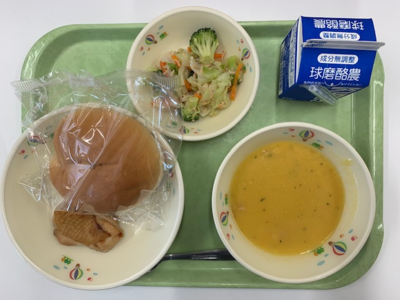 バーガーパン、牛乳、照り焼きチキン、コーンポタージュ、ブロッコリーサラダです。