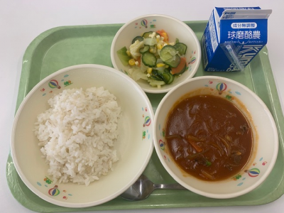 麦ごはん、牛乳、ハヤシの具、フレンチサラダ、(中学生のみ)奥球磨巻きでした。