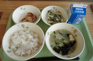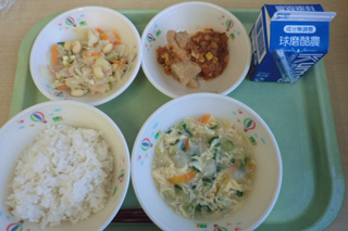 今日の給食 投稿日時 : 2017/11/02 ei/ho ★麦ごはん★牛乳★鶏肉のアップルソースかけ★大豆とツナのサラダ★白菜と卵のスープ今日は、鶏肉料理です。肉と聞いてよろこんでいた人が多かったです。給食では、肉・ばかりでなく、魚・卵・大豆食品をメインにおかずを考えているので、肉が出ると大喜びする人が多いです。いつも出せたら良いのですが、いろいろな食品を食べることで、健康で大きくなれます。どの料理が出てもおいしいそうといわれるようがんばりたいです。