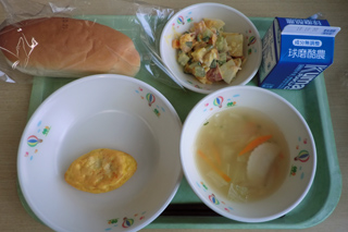 今日の給食 投稿日時 : 2018/10/03 ei/ho ★ミルクパン★タンドリーチキン★梅ドレッシングサラダ★野菜スープ先週の土曜日はお弁当でしたが、どれもおいしそうで、みんな笑顔で食べていました。昨日運動会でしたので、今日は久しぶりの給食です。梅ぼしが苦手で、苦労している人もいましたが、時間内に食べた人が多く、残食はパン一口でした。タンドリーチキンがとても人気でした。運動会のあとで、疲れている人もいますが、しっかり食べて、今週のこり2日元気に過ごしてほしいです。