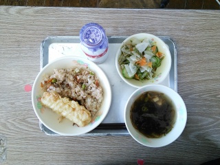 今日の給食 投稿日時 : 2015/06/04 tei ☆たこめし ☆牛乳 ☆もずくスープ ☆いか天ぷら☆大根と茎わかめ酢の物 今日から来週水曜日まで「歯と口の健康週間」ということで給食では「かみかみメニュー」を実施します。第1回目の今日は、「たこ」「いか」「茎わかめ」を使ったメニューでした。よく噛むことは体にとてもいい働きをしてくれます。よく噛んでさらに健康になりたいですね。