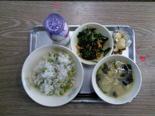 今日の給食 投稿日時 : 2015/06/16 admin ☆枝豆ごはん ☆牛乳 ☆玉ねぎのみそ汁 ☆ほうれん草の和え物 ☆みたらし団子 今日は、和菓子の日ということで、みたらし団子でした・。お餅やお菓子を食べて悪いものを追い払う行事「 嘉祥(かじょう)」に由来するものだそうです。ということで今日は、みたらしあんを手作りにしてみました。
