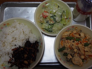 今日の給食 投稿日時 : 2015/09/24 ei/ho ★麦ごはん★牛乳★炒りどうふ★ひじきのいり煮★キャベツの梅マヨ和え今日は、ひじきのいり煮でした。ひじきには、カルシウムや鉄分、食物繊維がたくさん含まれています。骨を丈夫にしたり、疲れをとったりしてくれるので運動会の練習をがんばっているみなさんにぜひ食べていただきたい食材の一つです!!