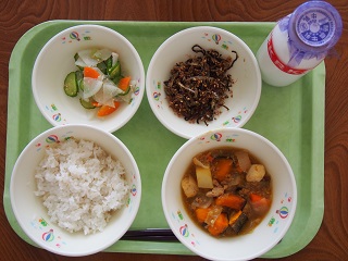 今日の給食 投稿日時 : 2016/12/16 ei/ho ★根菜入りカレー(麦ごはん)★牛にゅう★べっこう漬け★うのはなサラダ今日は、根菜がたっぷり入ったカレーとうのはなサラダでした。うのはなサラダには、とうふを作るときにできる「おから」が使われていました。おからには、栄養がたっぷり入っていて、食物せんいも入っているのでおなかのそうじもしてくれますよ♪