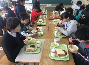 今日の給食 投稿日時 : 2017/01/25 ei/ho ★食パン★牛にゅう★コーンとたまごのスープ★くじらカツ★キャベツのレモンあえ今日は、昭和30年代の給食を再現ということで、くじら肉を使ったカツでした。そして、給食週間ということで調理員さんや担外の先生方に参加していただいて「招待給食」を行いました。日ごろの感謝の気持ちを伝える場となっていてうれしく思いました。