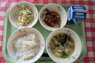 今日の給食 投稿日時 : 2017/04/18 ei/ho ★麦ごはん★牛乳★魚のスタミナあげ★ごまネーズあえ★とうふのみそ汁今日は、和食の献立です。みそ汁は毎日食べてほしい献立のひとつです。下村婦人会で作ったみそを使っています。