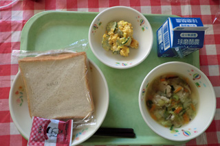 今日の給食 投稿日時 : 2017/04/19 ei/ho ★食パン(マーシャルビーンズ)★牛乳★春キャベツの肉団子スープ★かぼちゃのアーモンドサラダ給食センターで手作りした肉団子です。だしが出ておいしいスープになりました。サラダも人気で、今日も完食でした。