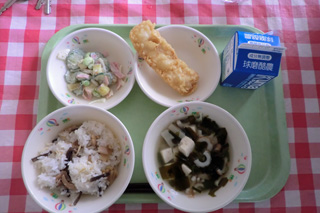 今日の給食 投稿日時 : 2017/04/28 ei/ho ★ひじきごはん ★牛乳 ★いわしのごま衣あげ ★大豆とツナのサラダ ★エビ団子スープ 今日は、ひじきごはんです。ひじきは、春になると新芽が出ます。鉄分などの無機質がとれます。