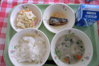 今日の給食 投稿日時 : 2017/04/25 ei/ho ★麦ごはん ★牛乳 ★いわしの生姜煮 ★れんこんサラダ ★団子汁 今日は、手作りだんご汁です。だんご汁は、 熊本県の郷土料理になります。今日は、小麦粉 白玉粉、スキムミルクのだんごでした。熊本県 には、トマトやさつまいもが入っただんご汁が あります。