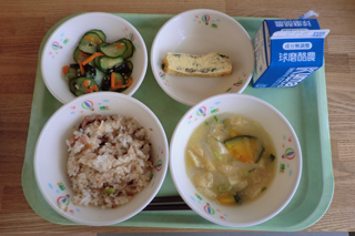 今日の給食 投稿日時 : 2017/07/11 ei/ho ★たこめし★牛乳★ちぐさやき★酢の物★かぼちゃの味噌汁今日は、熊本県の郷土料理たこめしです。今日は、天草のたこを使っています。天草では、旬になると干しだこにします。今の季節は、たこが干してある様子を見ることができます。