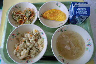 今日の給食 投稿日時 : 2017/09/22 ei/ho ★カレーピラフ★牛乳★トマトオムレツ★ごぼうときゅうりの和え物★野菜スープ今日は、久しぶりの洋食です。パンの日にすることが多いですが、今日の主食はピラフです。カレー風味が弱く、色もカレー色になっていないので、次回は、カレー粉を増やしたいと思います。