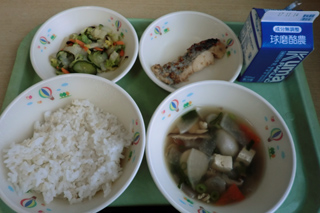 今日の給食 投稿日時 : 2017/11/24 ei/ho ★麦ごはん★牛乳★魚のもろみやき★大根の柚子香あえ★味噌汁今日は「和食の日」です。「和食」は昔から受け継がれてきた食の文化です。栄養バランスがよく、健康的な食事です。季節の野菜も(大根葉やゆず、さといもなど)使いました。食事の見本としてほしいです。