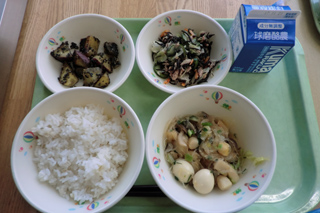 今日の給食 投稿日時 : 2017/11/09 ei/ho ★麦ごはん★牛乳★さつまあげのケチャップ煮★即席漬け★おひめさんだんご汁今日は、熊本県の郷土料理おひめさんだんご汁です。さつまいもと小麦粉で作っただんごが入った味噌汁になります。今日はうれしいことがありました。給食当番の人が「今日の汁おいしかったです。」と声をかけてくれました。だしが出ておいしくできていたのかなと思いました。郷土料理なので、次の世代に受け継がれていくとよいと思いました。