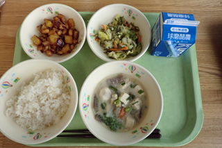 今日の給食 投稿日時 : 2017/11/30 ei/ho ★もぐもぐどんぶり★牛乳★すきこんぶあえ★豆乳豚汁今日は、もぐもぐとよくかんで食べる「もぐもぐどんぶり」です。旬のさつまいもとレンコン・大豆を揚げて、しらすぼしを入れて作りました。しっかりかんで、旬の食べ物の味をしっかりをかみしめて食べてくれたと思います。