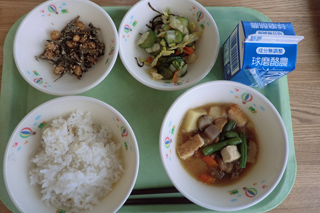 今日は豚肉の生姜焼きです。こどもたちがとても喜んでいました。食べ終わるのも早く、よかったと思いました。しかし、低学年の人は、歯が生え替わる頃なので、かみ切れないようで、食べるのに苦労していました。歯の大切さがよくわかる献立でした。