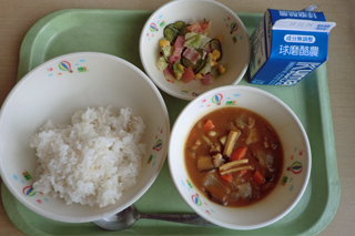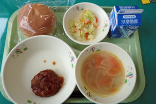 今日の給食 投稿日時 : 2018/10/03 ei/ho ★ミルクパン★タンドリーチキン★梅ドレッシングサラダ★野菜スープ先週の土曜日はお弁当でしたが、どれもおいしそうで、みんな笑顔で食べていました。昨日運動会でしたので、今日は久しぶりの給食です。梅ぼしが苦手で、苦労している人もいましたが、時間内に食べた人が多く、残食はパン一口でした。タンドリーチキンがとても人気でした。運動会のあとで、疲れている人もいますが、しっかり食べて、今週のこり2日元気に過ごしてほしいです。