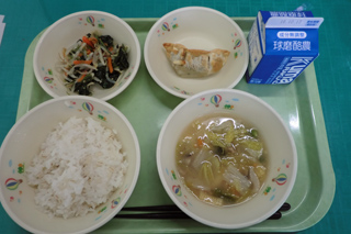 今日の給食 投稿日時 : 2018/10/11 ei/ho ★麦ごはん★中華風煮★焼き餃子★もやしの中華あえ今日は、中華料理です。餃子がとても人気でした。そして、中華風煮には、いろいろな食材が入っており、おいしいだしがたくさん出ていました。今日は残食が無かったのでよかったです。寒くなってきたので、残さず食べて、病気に負けない体をつくってほしいです。
