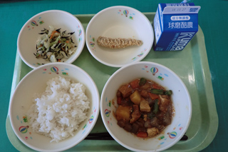 今日の給食 投稿日時 : 2018/10/26 ei/ho ★きのこカレー★ベーコンサラダ今日はきのこたっぷりカレーです。しいたけ・えのきだけ・エリンギが入っています。きのこが苦手という人もいましたが、ほとんどの人が時間より前に食べ終わっていました。今日のカレーは辛さも控えめにしていたので、一年生には食べやすかったようです。