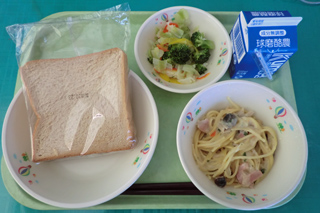 今日の給食 投稿日時 : 2018/10/24 ei/ho ★黒糖パン★きのこのクリームスパゲティ★カラフルサラダ今日は久しぶりに黒糖パンを出しました。いつもの食パンと同じだと思っている人がいて、クラスでパンの味や色について話が出ました。いつもコッペパンや食パンが多いので、他のパンも紹介できたらよいと思いました。