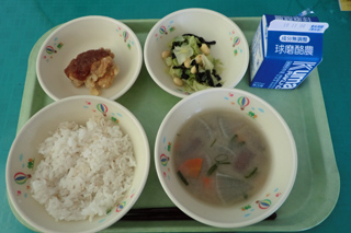 今日の給食 投稿日時 : 2018/10/30 ei/ho ★麦ごはん★鶏肉のりんごソースかけ★大豆とわかめのサラダ★大根のみそ汁 今日は、大豆の入ったサラダです。畑の肉と呼ばれ、植物性たんぱく質を摂ることができます。豆が苦手な人は、最後に食べていた人もいましたが、残食は少なく、よく食べてくれました。 給食では、豆も食べてほしいので、献立に出すことが増えてきました。苦手な人は、おうちでも食べる練習をしてくれるとうれしいです。