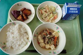 今日の給食 投稿日時 : 2019/02/28 ei/ho ★麦ごはん ★肉とうふ ★野菜のごまダレ ★大学芋 今日は、豆腐たっぷりの肉豆腐です。いつもより大きく切って、豆腐が崩れないよう気を付けて煮込んでもらいました。豆腐が多いので、苦手な人もいるかと心配しましたが、残食ゼロでした。これからも大豆や大豆製品を残さず食べてもらえるよう工夫していきたいです。