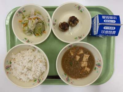 麦ご飯、牛乳、麻婆豆腐、ひじきシュウマイ、こんにゃくサラダでした。