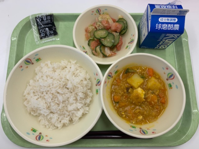 麦ごはん、牛乳、かぼちゃのそぼろ煮、トマトサラダ、一食ひじきのりつくだ煮でした。