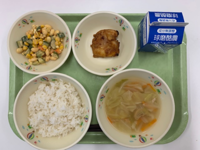 麦ごはん、牛乳、カリカリチキンのねぎソース、五目スープ、カラフルサラダでした。