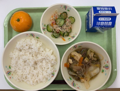 麦ごはん、牛乳、すき焼き、切り干し大根の酢の物、みかんでした。