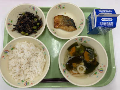 麦ごはん、牛乳、すまし汁、魚のごまみそ焼き、ひじきの炒り煮でした。