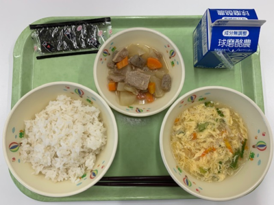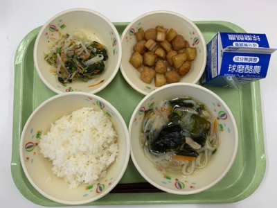 白ごはん、牛乳、汁ビーフン、つくねと根菜の甘辛煮、もやしの中華あえでした。
