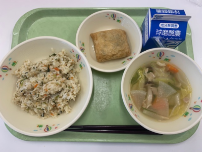ひきにく入り菜めし、牛乳、すいとん、しのだ煮でした。
