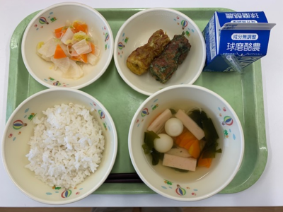 麦ごはん、牛乳、すまし汁、ちくわの二色揚げ、冬野菜の甘酢漬けでした。
