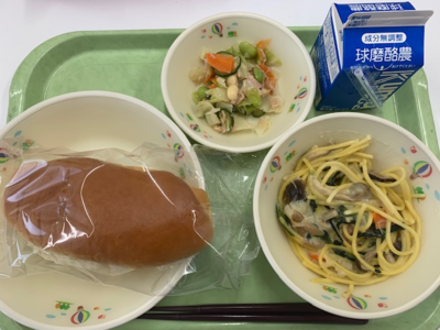 ミルクパン、牛乳、きのことほうれん草のクリームパスタ、大豆とツナのサラダでした。