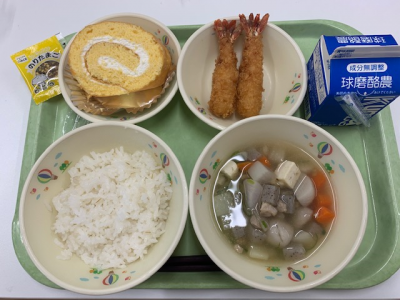 麦ごはん、牛乳、つぼん汁、えびフライ、奥球磨巻きでした。
