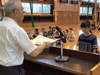 次に、小児がんの子どもたちに髪の毛を寄付するヘアードネーションの活動に取り組んだ6年生のたけなかさんに、免田ライオンズクラブから感謝状と記念品が渡されました。