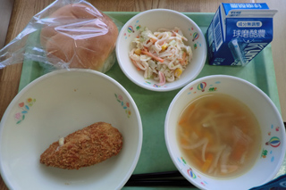 今日の給食 投稿日時 : 2017/11/01 ei/ho ★フィッシュバーガー(丸パン 魚のフライ オーロラサラダ)★牛乳★ビーンズスープ今日はセルフバーガーです。魚のフライにしっかり味がついていたので、サラダも一緒に入れると味がちょうど良かったと思います。大根がおいしい季節になってきたので、きゅうりでなく、大根をたくさん使ったサラダが多くなってきます。少し苦みがあるので、食べにくいこともあると思いますが、きゅうりは夏野菜なので、季節にあった野菜を食べてほしいと思います。