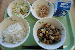 今日の給食 投稿日時 : 2017/11/02 ei/ho ★麦ごはん★牛乳★鶏肉のアップルソースかけ★大豆とツナのサラダ★白菜と卵のスープ今日は、鶏肉料理です。肉と聞いてよろこんでいた人が多かったです。給食では、肉・ばかりでなく、魚・卵・大豆食品をメインにおかずを考えているので、肉が出ると大喜びする人が多いです。いつも出せたら良いのですが、いろいろな食品を食べることで、健康で大きくなれます。どの料理が出てもおいしいそうといわれるようがんばりたいです。