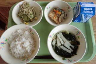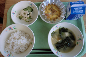 今日はさばの南蛮漬けです。魚よりも南蛮漬けの野菜が苦手という人が多く、酸っぱいと言っていました。魚はどうにか完食していました。給食で、酢を使う料理は苦手の人が多く、出すときに迷いますが、暑いときには酸っぱい物を食べた方がよいので、毎年出しています。大人になるとおいしい味なので、食べ続けてほしいと思います。