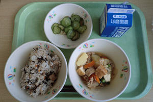 今日の和え物は、なすが入っています。残食が多いのではという意見もありましたが、なすを食べる勉強も必要だと思い、いつもより量を減らして出しました。苦手で苦労して食べている人もいましたが、残食は一人分程度でした。