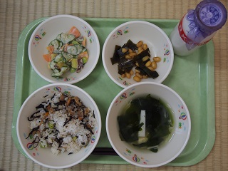 今日の給食 投稿日時 : 2016/11/15 ei/ho ★ひじきごはん★牛にゅう★とうふのすましじる★秋のみかくサラダ★大豆とこんぶのにもの今日は、秋のみかくサラダということで、秋が旬の「さつまいも」をつかったサラダでした。さつまいもには、ビタミンCがたくさんふくまれているので、かぜを予防したり、はだを強くしたりしてくれますよ。