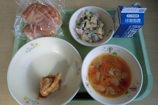 今日の給食 投稿日時 : 2018/01/17 ei/ho ★米粉パン★牛乳★鶏肉のバーベキューソース★さつまいものサラダ★ミネストローネ今日のバーベキューソースがおいしいとたくさんの人に言ってもらえました。休みが多かったのですが、ほどんど残食がありませんでした。休みが増えて来ているので、しっかり食べて病気に負けない体をつくってほしいです。