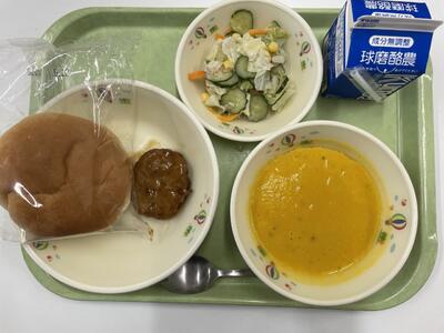人参ポタージュには人参、かぼちゃ、玉ねぎを炒めて、ミキサーにかけ、ペースト状にしたものが入っています。